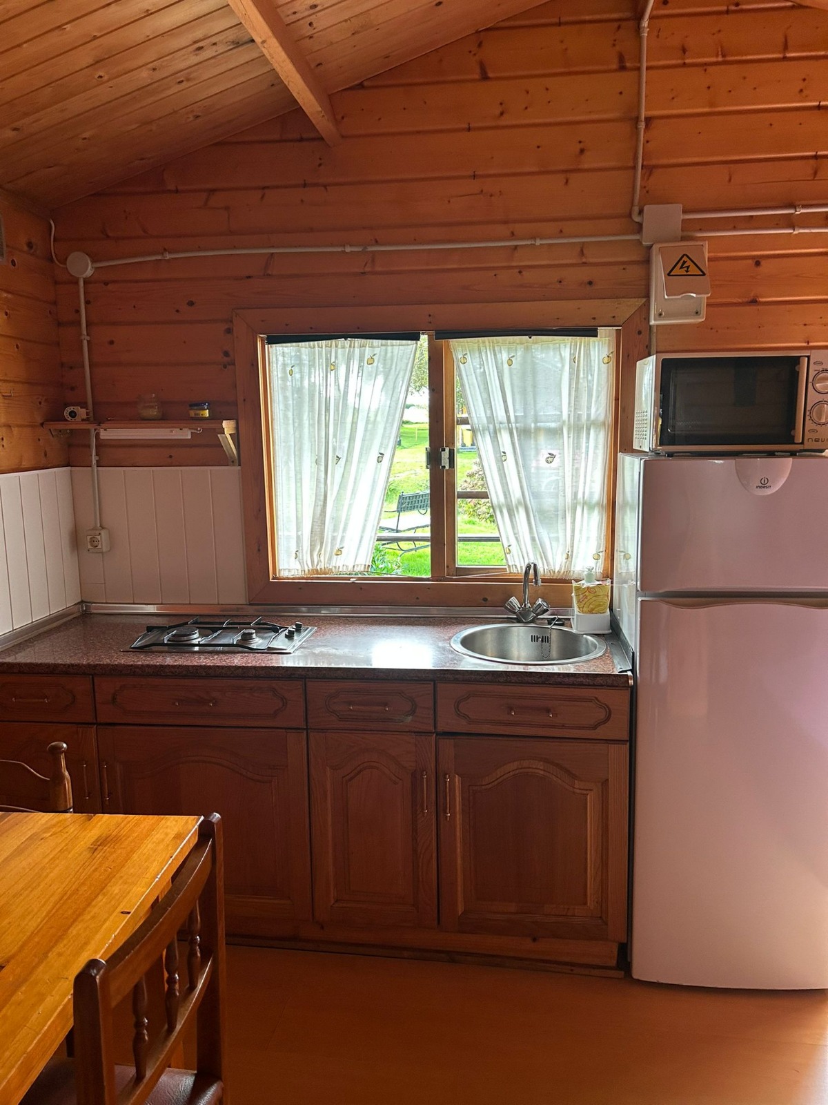 Las cabañas medianas disponen de un pequeño comedor con TV, cocina equipada con fogones de gas nevera, microondas, vajilla, cubertería y menaje variado para cocinar (sartenes, cazos, cafetera, ensaladera, fuente, etc.) y baño completo con inodoro, lavabo, ducha y secador.